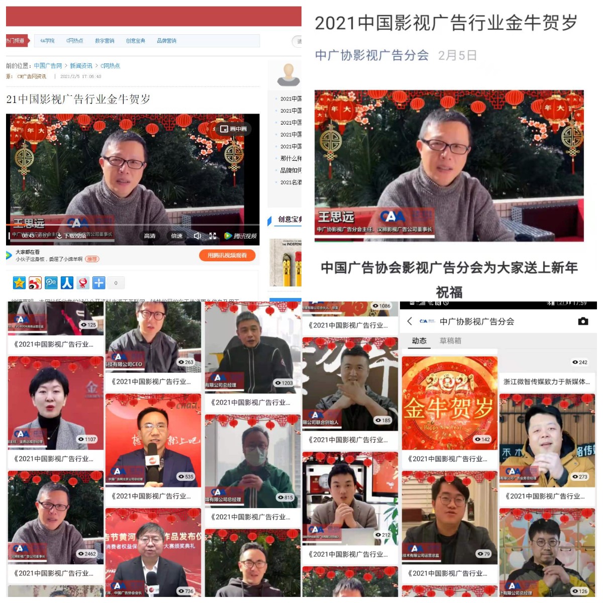 2021年的1月份影视广告分会再次组织开展了会员单位的拜年视频收集和录制工作,得到了20余家公司的支持,《2021中国影视广告行业金牛贺岁》拜年视频春节期间在天游8线路检测中心网官网、微博,和中广协影视广告分会微信、视频号等自媒体资源进行了广泛传播,得到了社会各界广泛的好评,点击率突破了10万次。