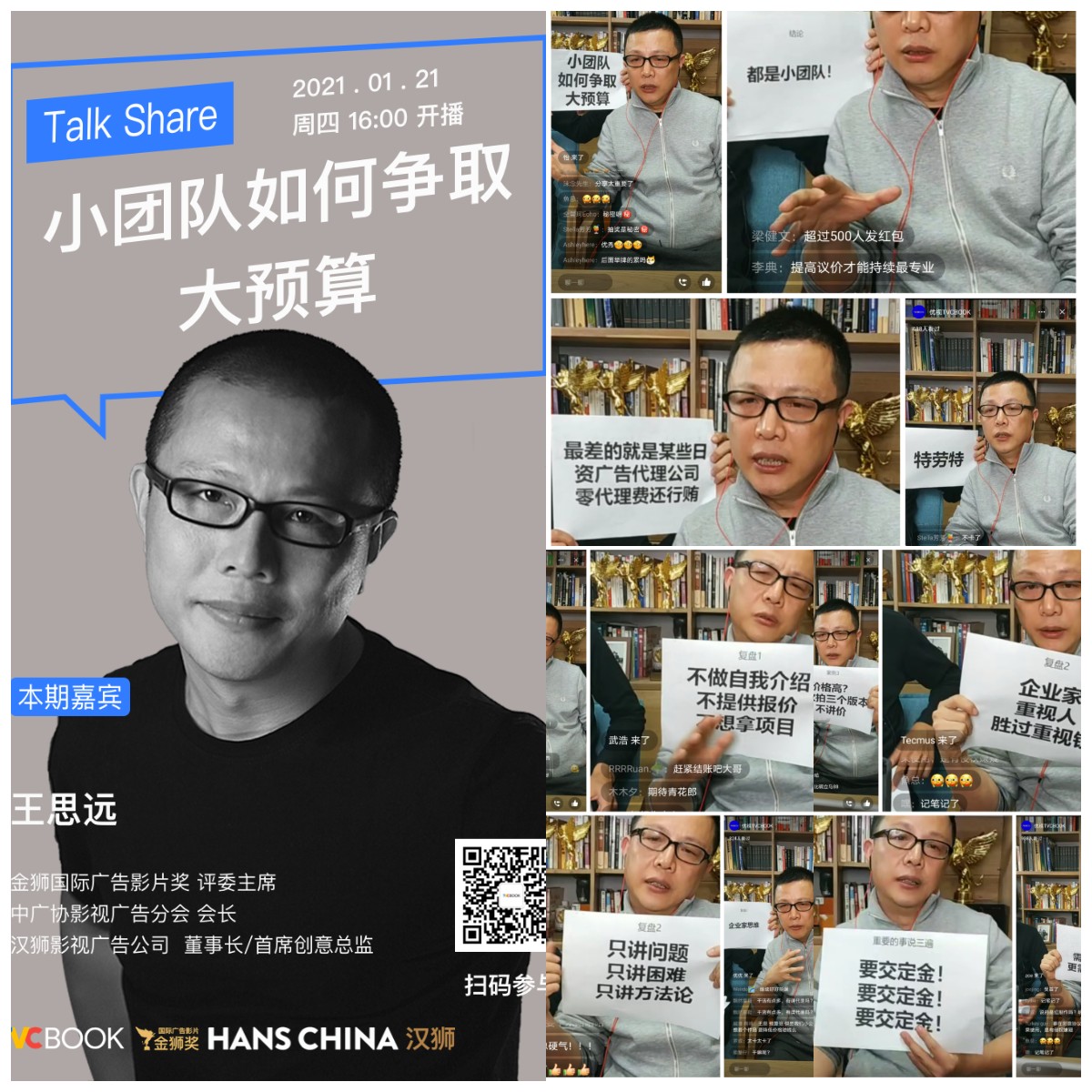 2021年1月7日上海赤马传媒创始人马骏先生为我们分享了“疫情下还能实现逆增长这家公司是如何做到的?”。2021年1月21日中广协影视广告分会主任/汉狮影视传媒董事长王思远先生为我们分享了“小团队如何争取大预算?”精彩演讲。